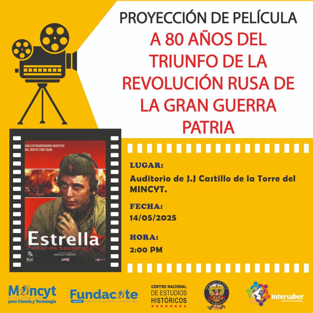 Caracas, 12 de mayo 2025. – En el marco de la conmemoración del 80º aniversario del triunfo de la Revolución Rusa en la Gran Guerra Patria, Intesaber Centro de Pensamiento, en colaboración con el Centro Nacional de Estudios Históricos, el Ministerio del Poder Popular para Ciencia y Tecnología, Fundacite Caracas, y la Embajada de Rusia en Venezuela, se complace en anunciar la proyección de la película «Estrella: Señal de Socorro». Este evento se llevará a cabo el miércoles 14 de mayo a las 02:00 PM en el auditorio J.J. Castillo de la Torre del Mincyt, esquina El Chorro.